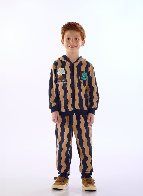 Conjunto infantil para menino em super cotton felpado (algodão e elastano), composto por jaqueta com capuz e calça, indicado para os dias mais frios. A jaqueta possui capuz, fechamento frontal em zíper, punhos e barra em ribana, bolsos funcionais e estampa listrada com aplicação de bordado, criando um visual marcante e delicado. A calça acompanha a proposta com estampa coordenada e conta com elástico na cintura, bolsos funcionais, punhos na barra, braguilha e cadarço decorativos, detalhes que facilitam o vestir e proporcionam um caimento adequado para a rotina infantil. Indicada para o dia a dia, passeios e atividades casuais.