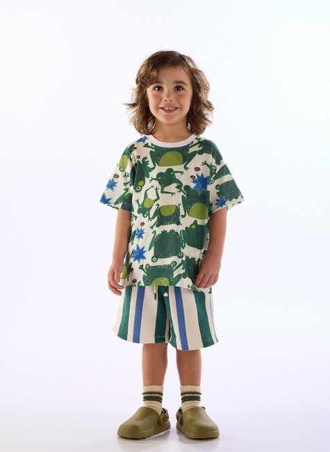 Transforme o dia a dia dos pequenos em uma grande aventura com este conjunto! Composto por uma camiseta oversized e por uma bermuda listradinha, traz peças ideais para garantir total liberdade de movimentos durante as brincadeiras. A camiseta é confeccionada em meia malha, que une algodão e viscose, proporcionando um toque extremamente macio. Conta ainda com gola redonda em ribana, queda de ombros, etiqueta personalizada e estampa digital exclusiva com o tema da família Brejo, "O Sapo Mora na Lagoa", trazendo cores vibrantes e um visual lúdico encantador. A bermuda em moletom sem felpa tem elástico na cintura, bolsos funcionais, e cadarço e braguilha decorativas. É a escolha perfeita para passeios no parque ou festinhas, combinando perfeitamente com tênis casuais.