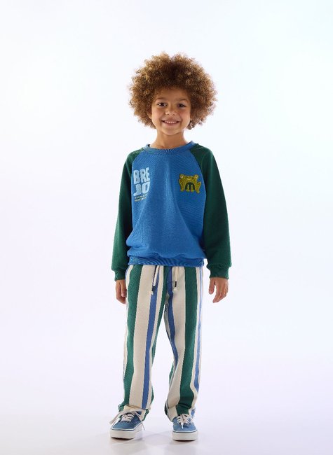 Direto da família Brejo, a Três e Já traz este conjunto de moletom sem felpa para menino é um convite à diversão e à imaginação. Inspirado em sapinhos, traz blusão com gola redonda com reforço, punhos e barra em ribana, estampa e bordado com forro interno em chenille frontal, além de estampa escrita "Um sapo ou um príncipe?" nas costas, acompanhado de uma calça listrada, que possui elástico e cadarço decorativo na cintura, além de braguilha falsa, etiqueta personalizada e bolsos funcionais. Peças que celebram a infância com cores vivas, garantindo que seu pequeno esteja sempre pronto para brincar, saltar e explorar com muito estilo e conforto.